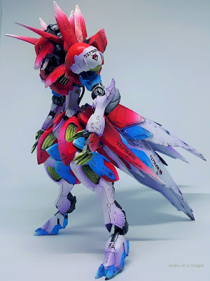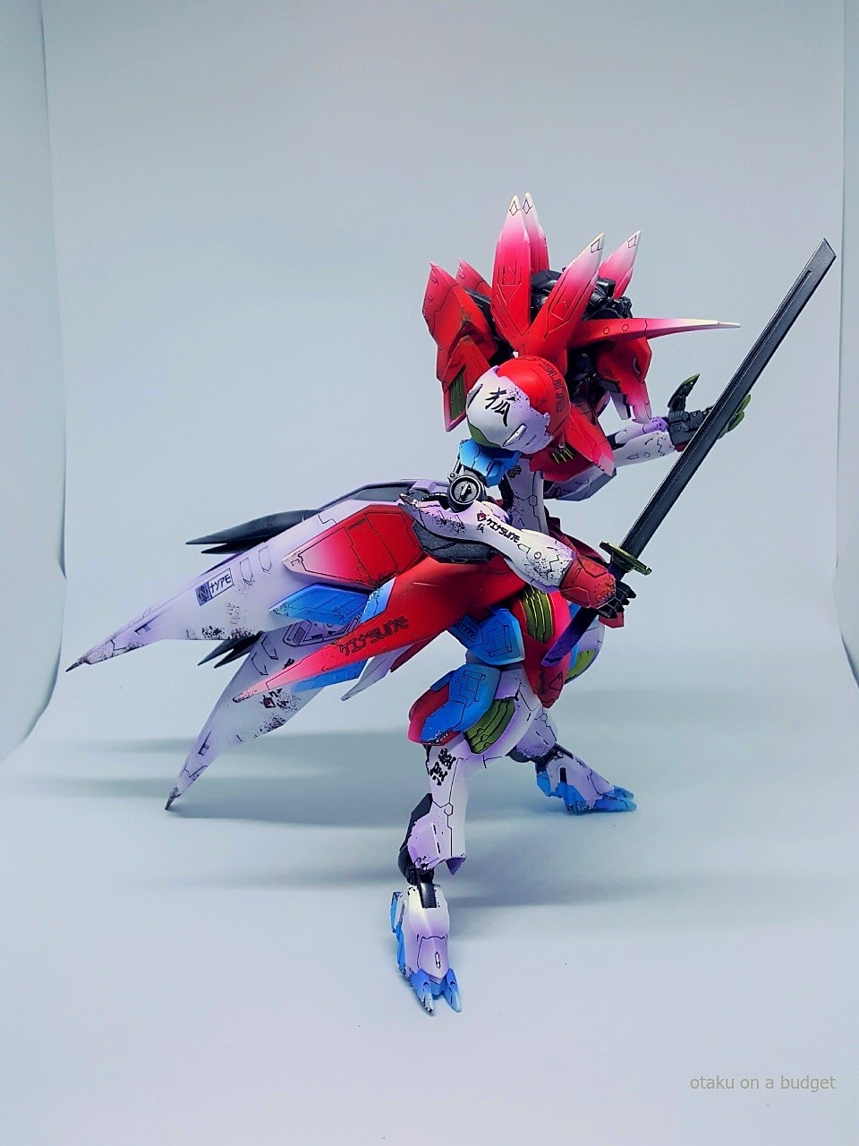 The feet are actually the simplest mod in the build. I just ditched the heel bits and made rectangular cuts on the foot armor so the frame could move forward more, giving it that reverse-joint look. It can balance on the feet just fine, and with the tail on and touching the ground it stands more like a tripod so it's pretty stable. The sword handle is from an Astray but I made a shorter, broader blade for it to match the ninja theme of her opponent.